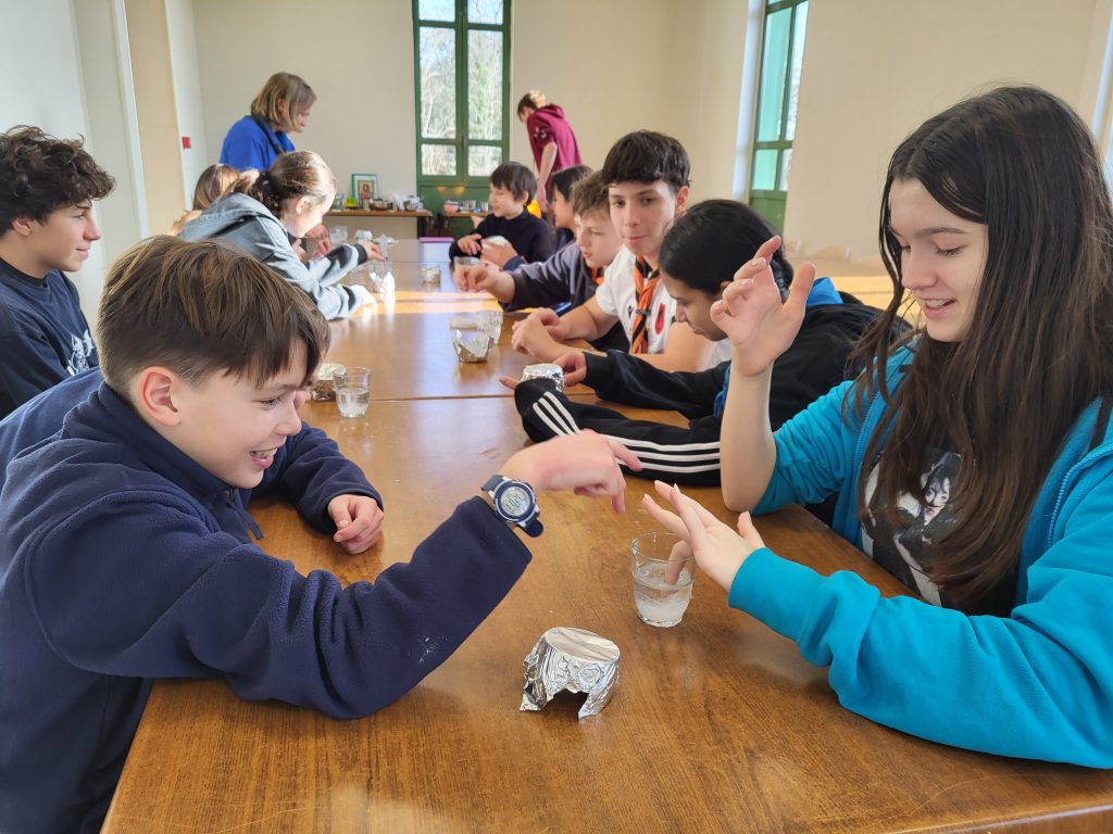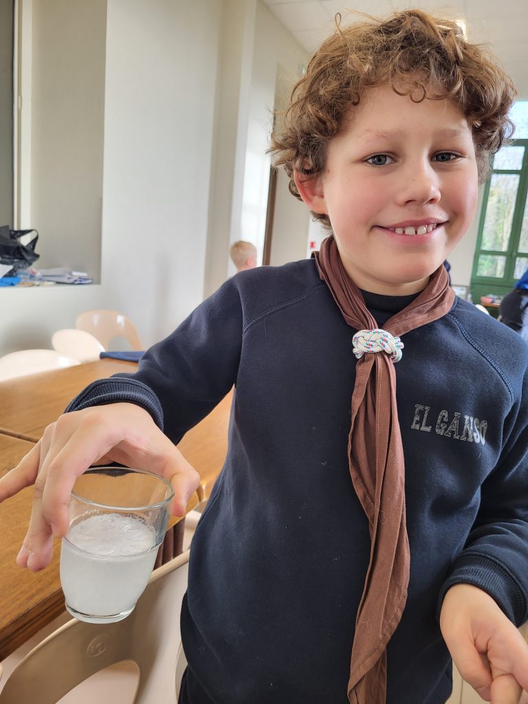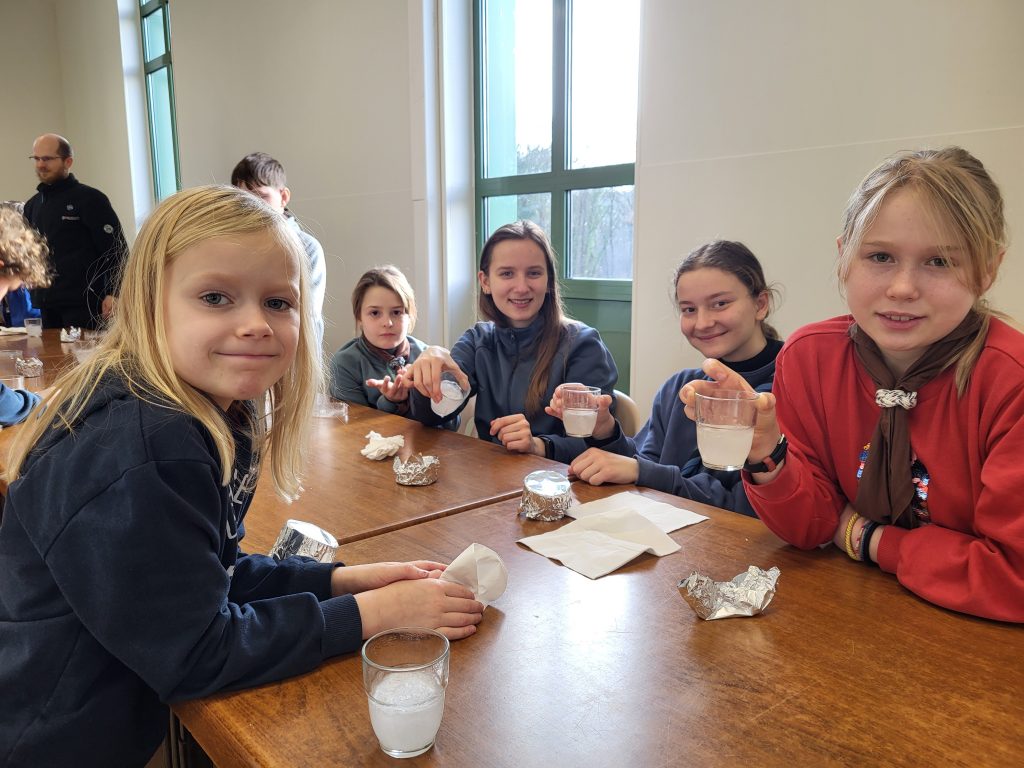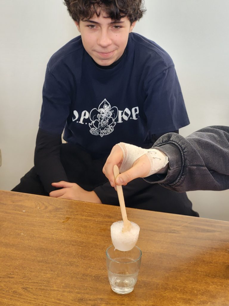 Осина вновь пришла на помощь ребятам и, согласно полученной инструкции, провела с ребятами интересный эксперимент. Сперва был подготовлен перенасыщенный раствор ацетата натрия, то есть много вещества растворили при высокой температуре, а потом охладили раствор до комнатной температуры. При добавлении в раствор щепотки исходного вещества (ацетата натрия) запускалась реакция кристаллизации, то есть образование кристаллов вещества, внешне очень похожих на лёд. Эта реакция протекает быстро, в несколько секунд, и с выделением тепла так, что кристаллы «разогреваются» до 50 градусов. Каждый участник лагеря получил стаканчик с таким раствором и возможность запустить реакцию. Занимательно, что многие попробовали опустить щепотку вместе с пальцем и почувствовали на себе горячее тепло «льда». К слову, такая реакция используется в основе «мгновенных тепловых пакетов» для оказания первой помощи для быстрого согревания.
