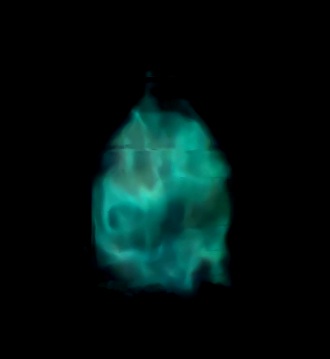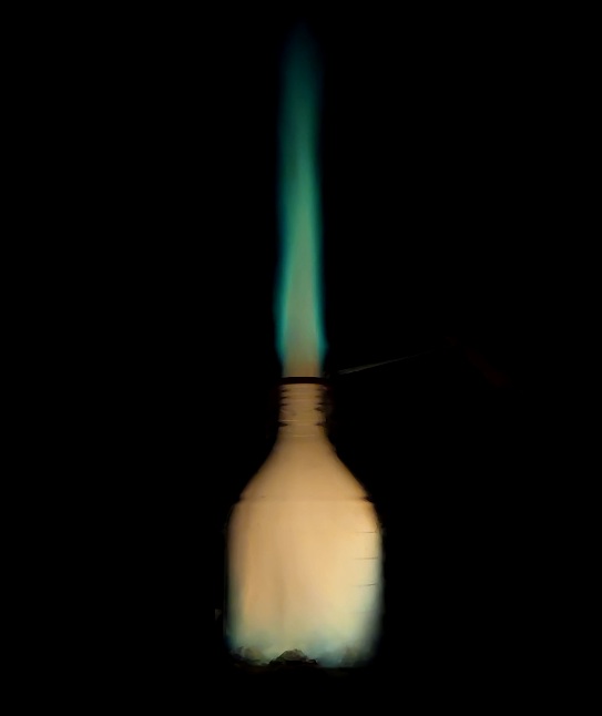 Эксперимент проходил в несколько этапов. Сначала соляную кислоту подкрасили медно-содержащей солью в зеленовато-синеватый цвет. Далее добавили шарики фольги, которые запустили реакцию, при которой начал выделяться водородный газ. Ни для кого не секрет, что при поджигании газ горит. Присутствие меди придало пламени зеленовато-синеватый оттенок. К тому же горение сопровождалось громким звуком, напоминающий взрыв хлопушки. Поджигая несколько раз, именно «спокойного, мирного сияния» у нас не вышло, а получилось, скорее, серия «взрывов», будто мы испытывали мотор для космического корабля. Это всё равно получилось красиво и впечатляюще! (Эксперимент проходил с учётом принятых необходимых мер предосторожности).